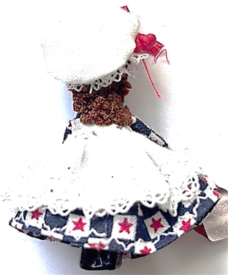 Retired artist Ethel Hick's Angel Children dolls are highly collectible. In the mini world these dolls are considered a doll's doll for a nursery or toy scene. The sweet hand painted porcelain face and body are dressed in red, white and blue details. Here brown curly hair is topped with a white mob cap trimmed with silk ribbon bow.