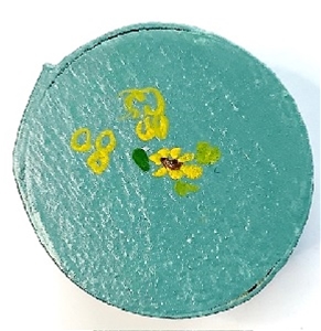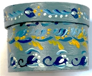 Hand painted round wood box in an old German style. Box is signed by artist Susan Phillips with her signature yellow daisy. Wood lid is removeable.