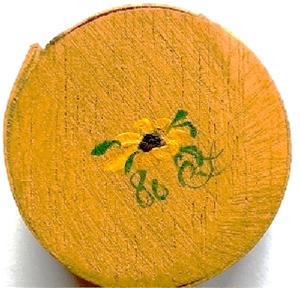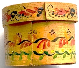 Hand painted round wood box in an old German style.  Box is signed by artist Susan Phillips with her signature yellow daisy. Wood lid is removeable.