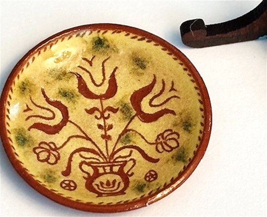 This beautiful redware sgraffito plate with a Germanic tulip design is signed by the artist. Includes the wood plate stand.