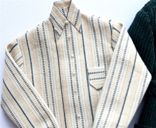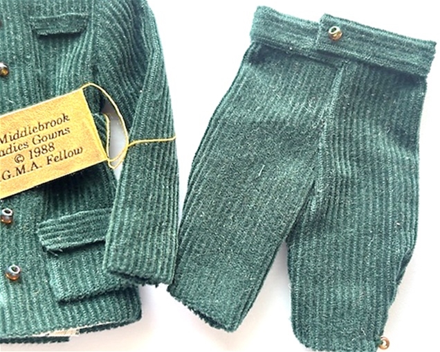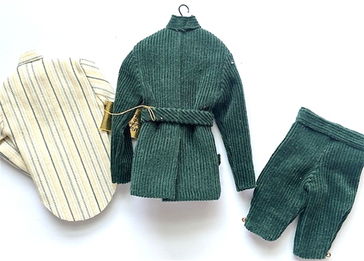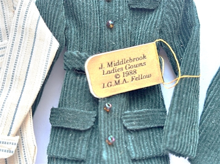 IGMA Fellow Janet Middlebrook, best known for her exquisite women's clothing in fine fabrics and beautifully detailed dolls, sways from her norm with this vintage green gentlemen's suit Ready for a man's dressing room or shop setting the green belted jacket and knickers have a posh look, maybe ready for a ride. The dress shirt is in a soft cotton batiste in a small stripe. The jacket is lined in the same fabric as the shirt. This collectible piece is perfect right down to the tiniest of buttons! Meant for display; can not be used to dress a doll.
