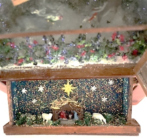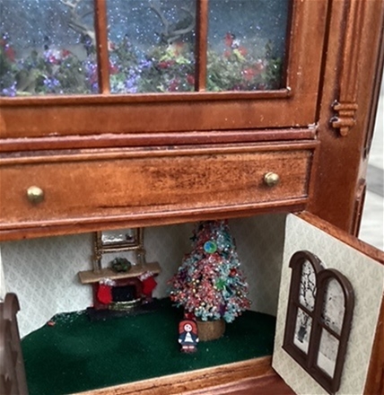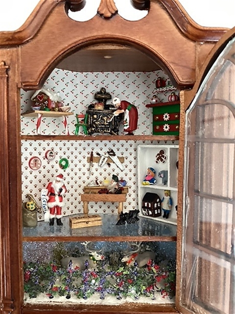 Original Bespaq Corner Cabinet filled with 1/144th Christmas scenes. Each shelf tells the story of the North Pole. From Mrs. Clause baking goodies to the reindeer patiently waiting, the tiny handcrafted pieces and ultra realistic. The extra surprise is the serene, sparkly nativity scene hidden in the drawer! The bottom doors open to a living room scene just waiting for Santa's arrival! Bespaq quality furniture is highly collected all over the world. Our own, in-house artist, Judy M., carefully curated the tiny scenes to bring the piece to life. There is a small hold drilled into the top if the collector prefers to insert a lightbulb to connect to their wiring system.