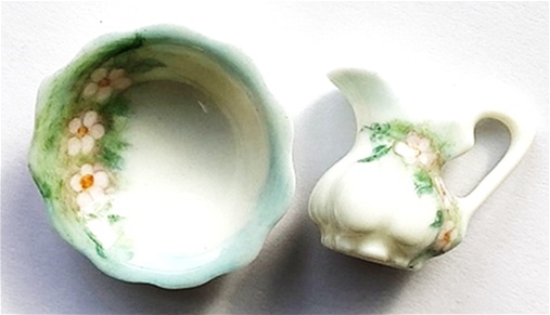 IGMA Artisan Ginger Wyatt, known for her exceptional porcelain accessories created this delicate pitcher and bowl. The pastel muted floral design is perfect for the traditional Victorian design. Signed by artist in 1982.