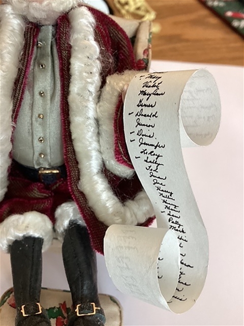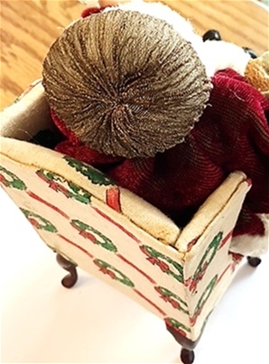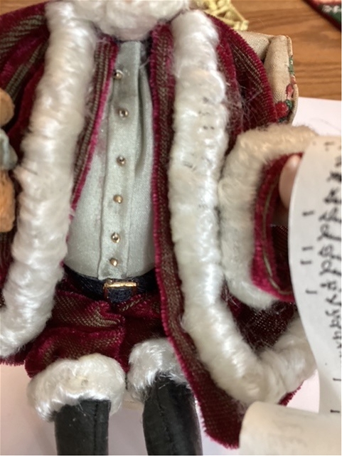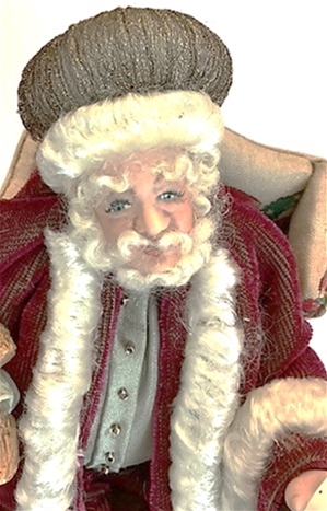 Nancy Quinby of Nantasy Fantasy created this whimsical Santa. He looks so comfortable in this original Bespag holiday chair. His friendly face is softly framed with white curls and beard. The rich fabrics are nicely trimmed in delicate trims. His leather boots have traditional buckles. His scroll list of good children is carefully checked. Do you see your name?