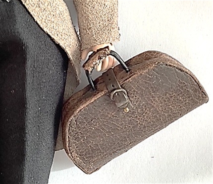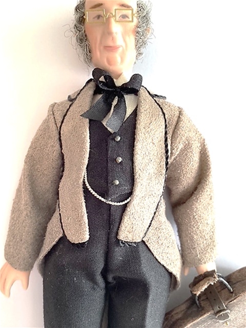 This charming bespectacled gentleman by renowned artist Paula Stinson has a full porcelain body. His soft suede cut away jacket is trimmed in scaled cording and delicate buttons. His silk tie and vest with fob chain gives him a distinguished look. Perhaps a country doctor? A travelor?