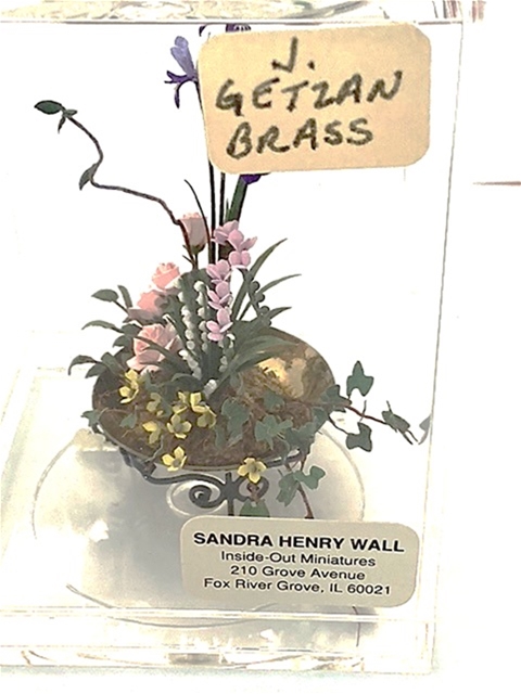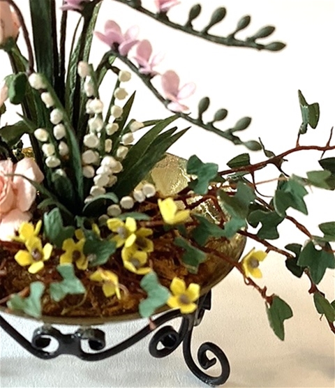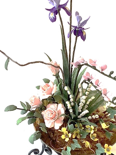 IGMA Fellow Sandra Henry Wall created this delicate floral arrangement with irises, pink roses and lilies of the valley in a stunning J. Getzan brass display bowl. Stunning. In original purchase container.